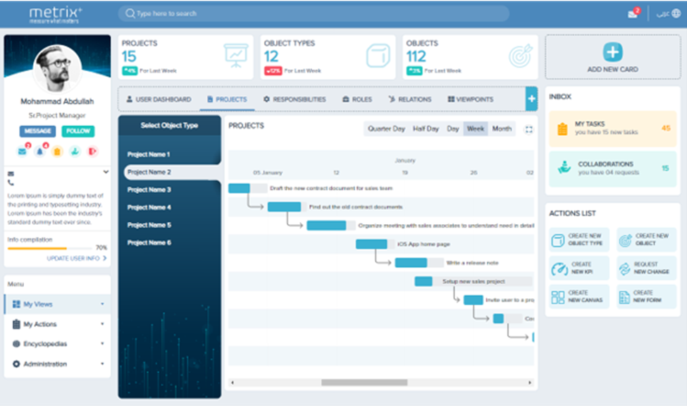 It enables organisations to capture context, correlate diverse internal elements and link them to well-defined metrics and results. MetrixPlus enables a proactive practices, manage the full cycle of Strategy-to-Execute including a robust management review, and automated SLAs to assign accurate roles roles and responsibilities to departments and employees, all with the help of AI algorithms.